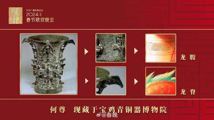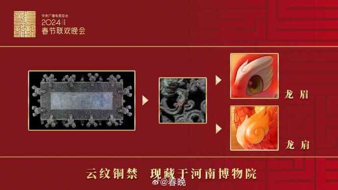稍早前,@春晚还发布了吉祥物“龙辰辰”的灵感来源。“龙辰辰”的龙面源自中国考古博物馆的绿松石龙形器;龙脊、龙腹来源于宝鸡青铜器博物院的何尊;龙眉和龙肩源自河南博物院的云纹铜禁;龙鳍灵感取自西安博物院的鎏金走龙;龙爪取自故宫博物院的九龙壁。