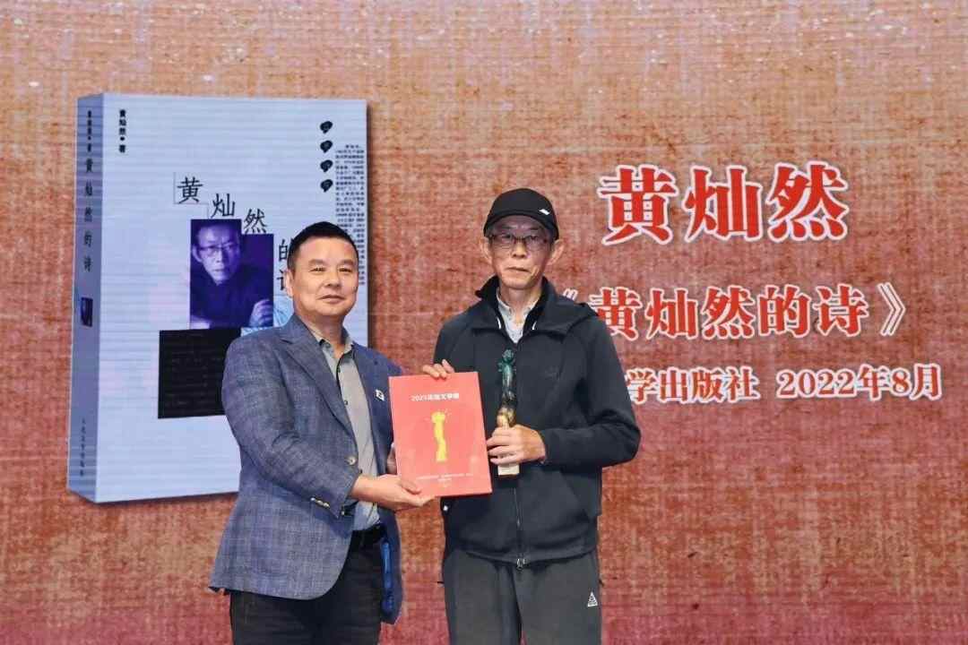 中国作家协会主席团委员、中国诗歌学会会长杨克为黄灿然(右)颁奖