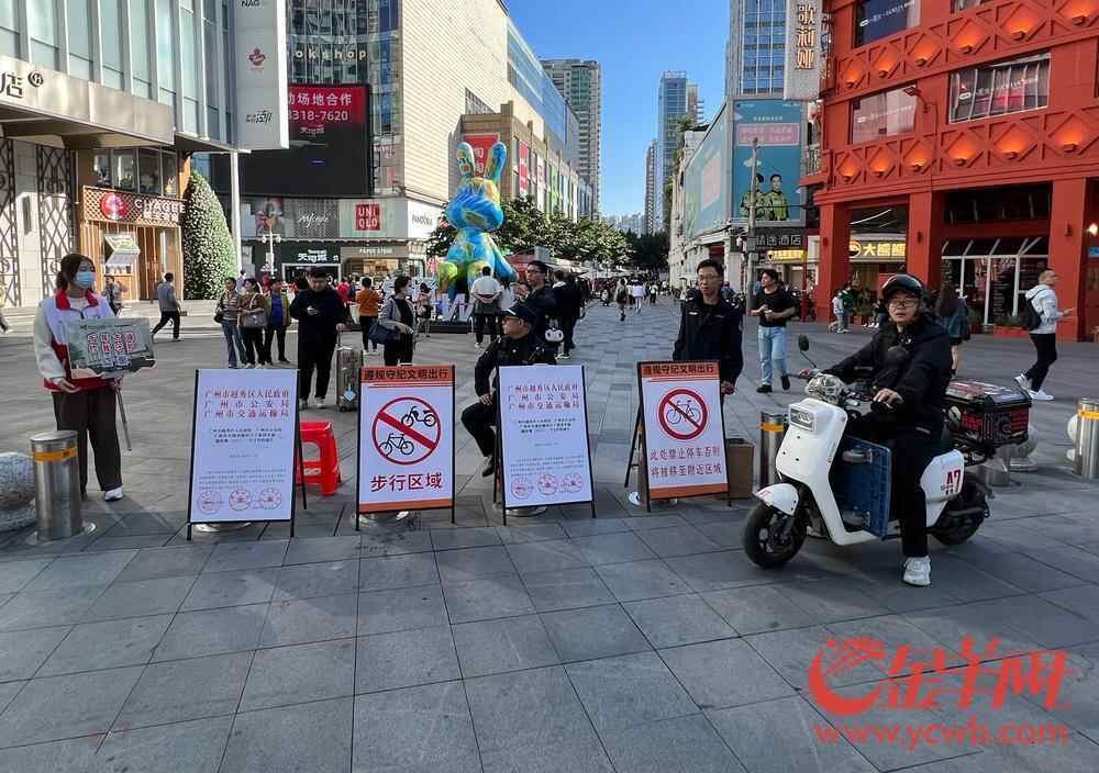 同在12月7日下午,记者走访北京路步行街发现,步行街在主要出入口均设置“电鸡”、自行车等车辆禁止入内标识,主要出入口还安排了城管、志愿者等工作人员疏导管理交通。但在明确公示及管理人员在岗情况下仍难以禁止“电鸡”、自行车等入内。