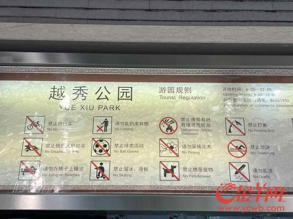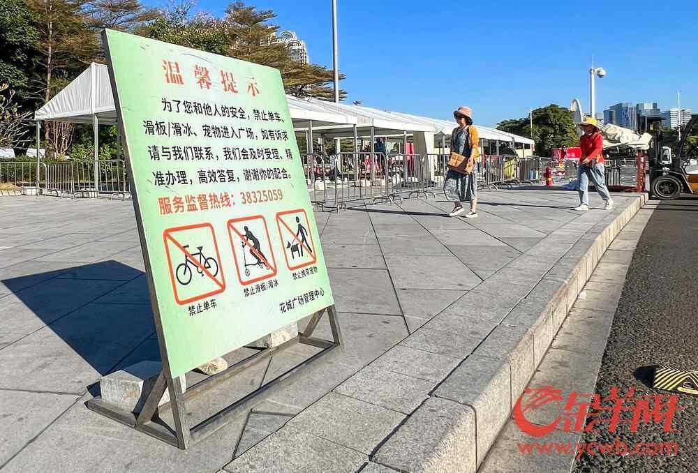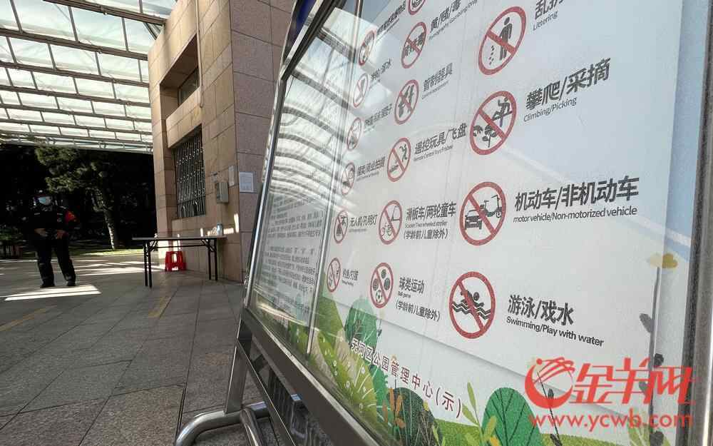 在天河公园,公园入口处不仅设有禁止机动车、非机动车、滑板车、两轮童车入内,入口处还有安保人员对计划骑车入园者进行劝导。在花城广场,记者同样看到管理方在显眼处设置禁止自行车、滑板等入内的告示。