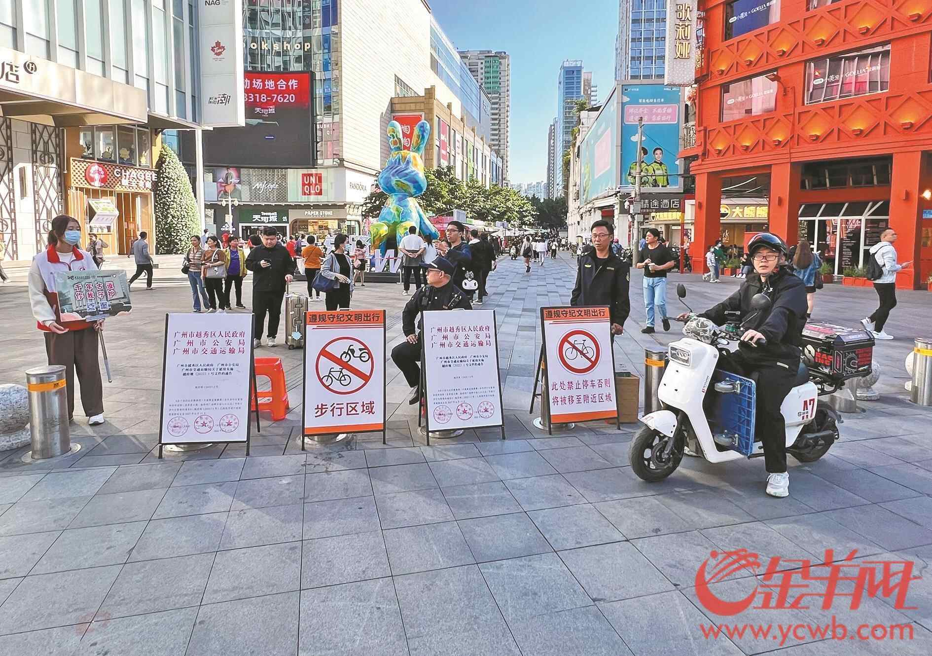 羊城晚报讯 记者梁怿韬、马思泳报道:《广州市公共休闲场地安全管理规定》(以下简称《规定》)将于明年1月1日起实施。根据《规定》,公园、广场、步行街全天禁止机动车、电动自行车、自行车以及电动独轮车、电动滑板车等具有动力装置的滑行工具进入。记者12月7日走访发现,不少场所已实施电动自行车、自行车等车辆禁止进入措施,但有市民无视管理要求及相关工作人员的劝阻,仍然骑车穿行。