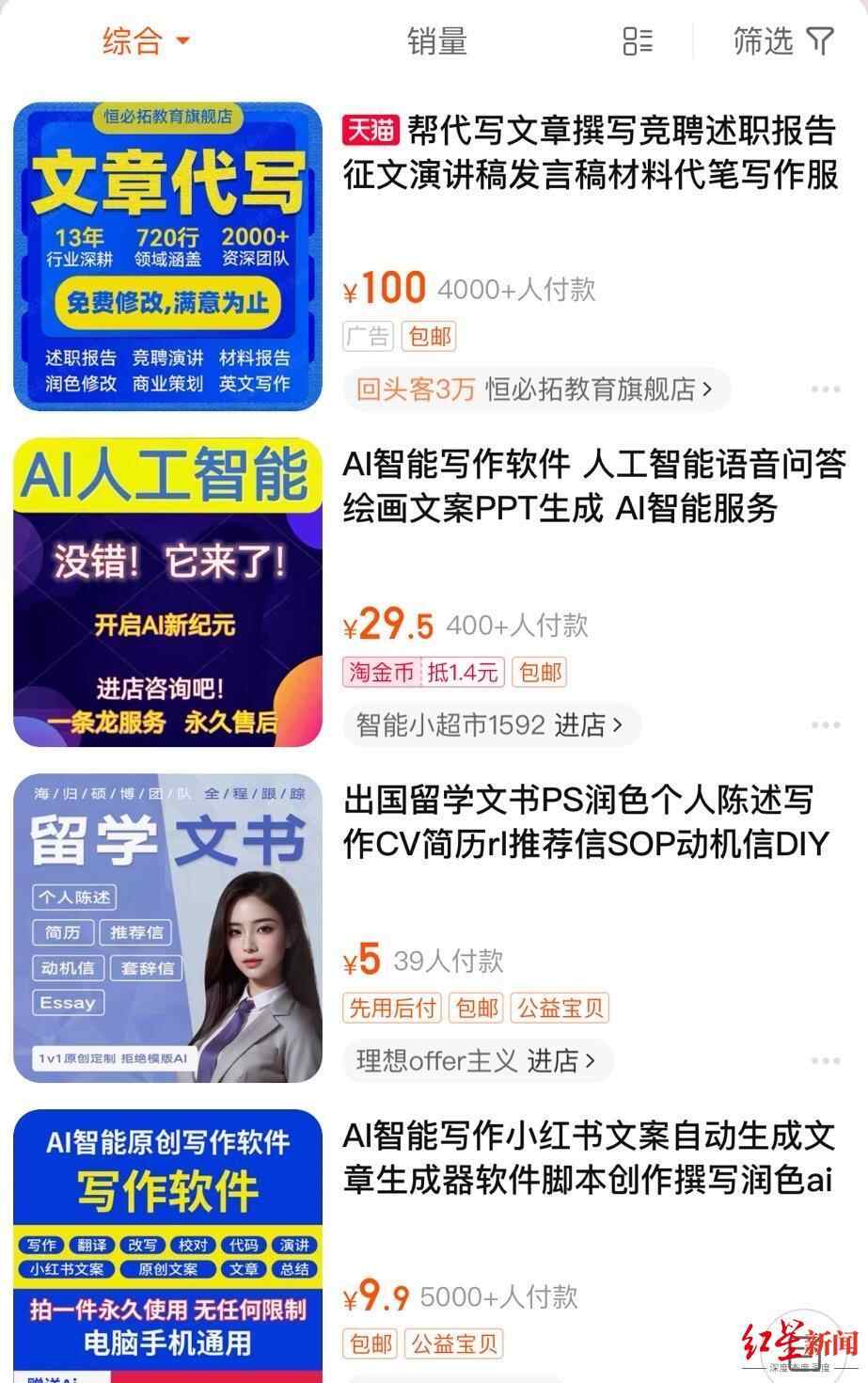 记者打开淘宝,输入“年终总结AI”“代写”等关键词,有许多相关产品。商家在产品介绍中写下宣传语:“AI智能原创、写作必备”“懒人办公”“三分钟急速交稿”……产品销量一般在几千单左右,有的店铺月销量达6万单以上。