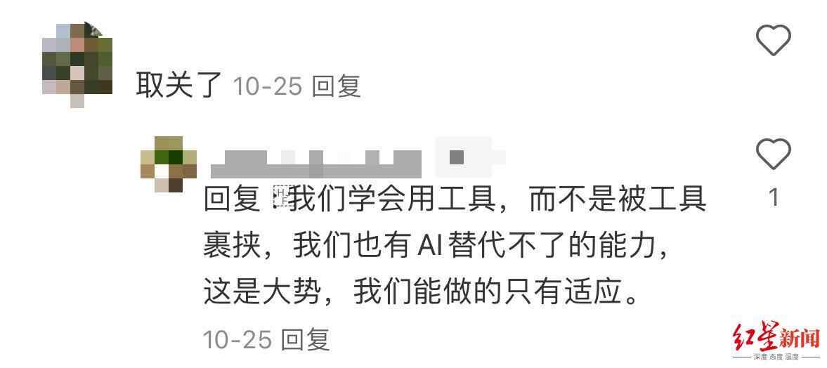 有粉丝因小梅背弃“人工写”而表示要“取关”,她直言回复:“我们学会用工具,而不是被工具裹挟,我们也有AI替代不了的能力,这是大势,我们能做的只有适应。”