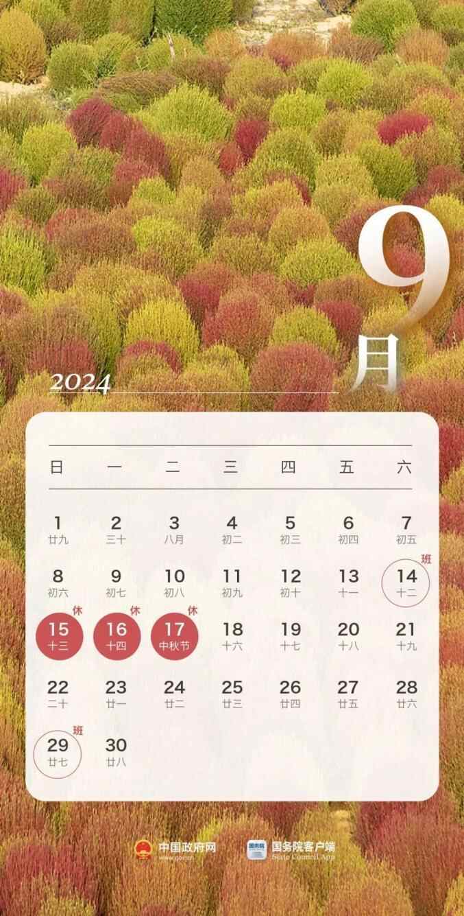 中秋节:9月15日至17日放假调休,共3天。9月14日(星期六)上班。