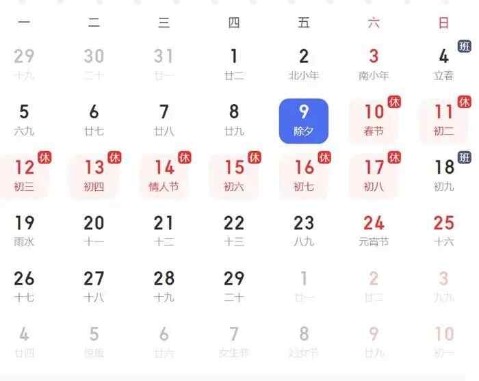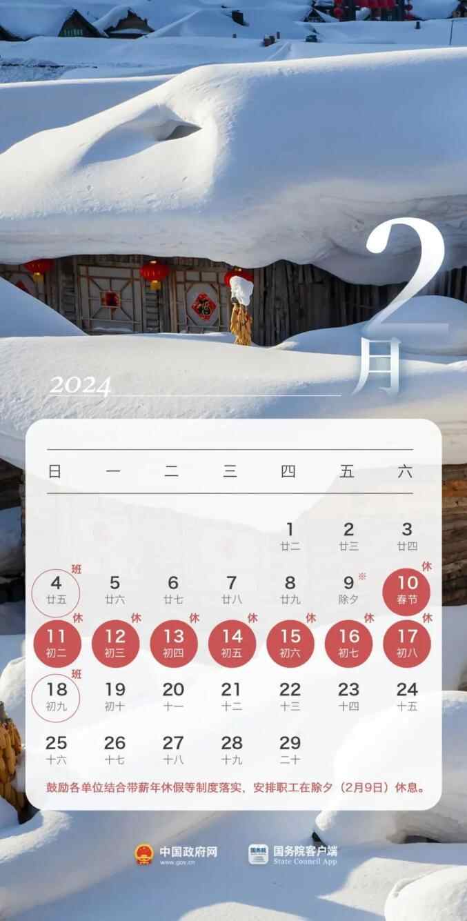 春节:2月10日至17日放假调休,共8天。2月4日(星期日)、2月18日(星期日)上班。鼓励各单位结合带薪年休假等制度落实,安排职工在除夕(2月9日)休息。