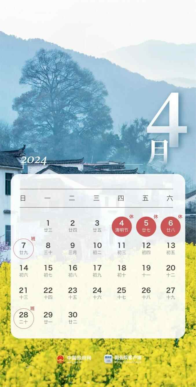 清明节:4月4日至6日放假调休,共3天。4月7日(星期日)上班。