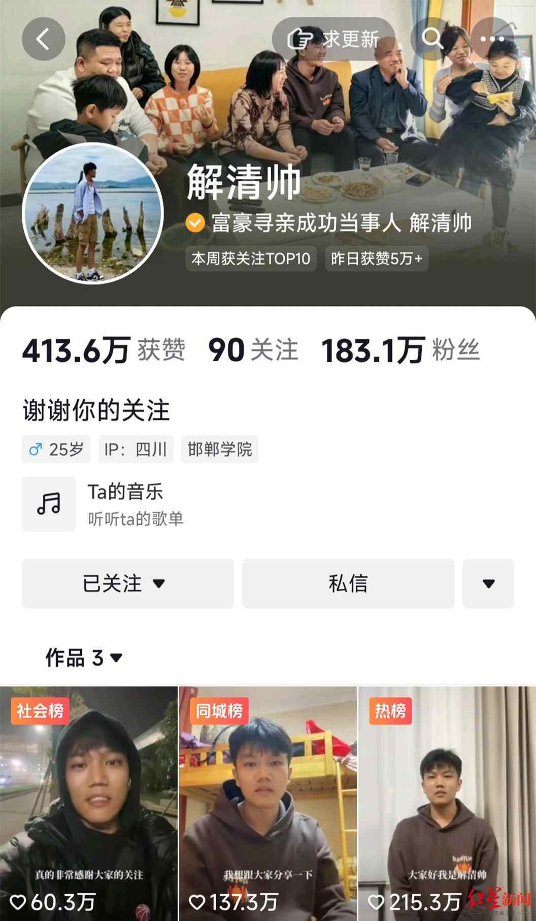自从寻亲成功后,解清帅也迅速在网络上走红。记者注意到,12月4日,解清帅在社交平台发布第一条视频,引发广大网友关注。在5天的时间里,他一共发布了3条视频,个人社交账号涨粉达183万。
