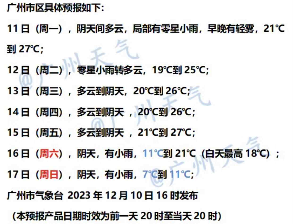 根据广州市气象台12月10日傍晚预计,广州市区12月11日至15日仍保持相对平稳天气。尽管12日前后有弱冷空气影响,但预计市区气温仅小幅波动,11日至15日市区日最低气温在19~21℃,日最高气温则在25~27℃。展望一股强冷空气将在16日前后影响广州,预计17日广州市区气温将降至7~11℃。