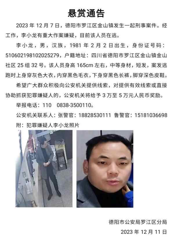 2023年12月7日,德阳市罗江区金山镇发生一起刑事案件。经警方调查,李小龙有重大作案嫌疑,目前该人员在逃。