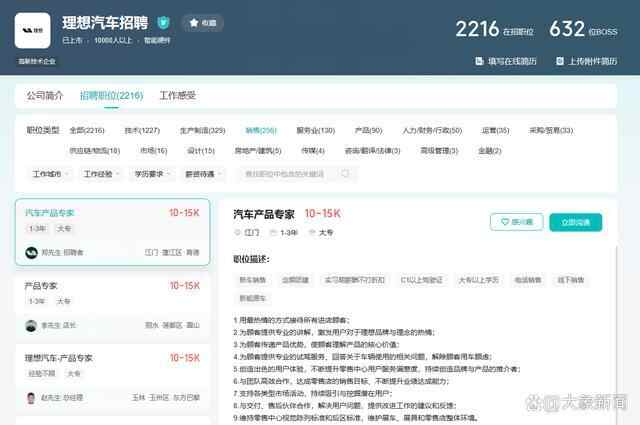12月12日,在BOSS直聘网站,记者查询招聘信息时留意到,目前,理想汽车在全国的在招职位共2216个,其中销售类型有200多个职位在招聘,郑州等地的招聘信息中还标出薪资待遇,例如在“汽车销售-郑州万象城”的招聘信息中,明确薪资范围为:15000-25000元/月,其中无责底薪7500+提成,六险一金,入职缴纳。而对于学历的要求为:大专及以上学历。