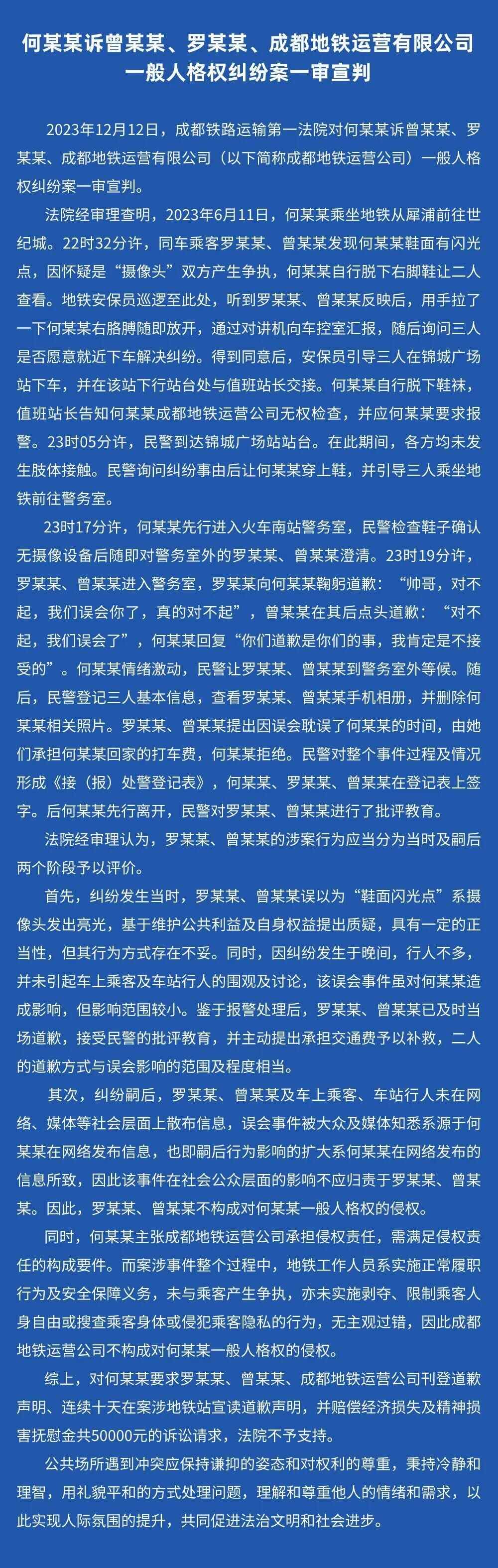 12月12日,据成铁第一法院官微消息,何某某诉曾某某、罗某某、成都地铁运营有限公司一般人格权纠纷案一审宣判。