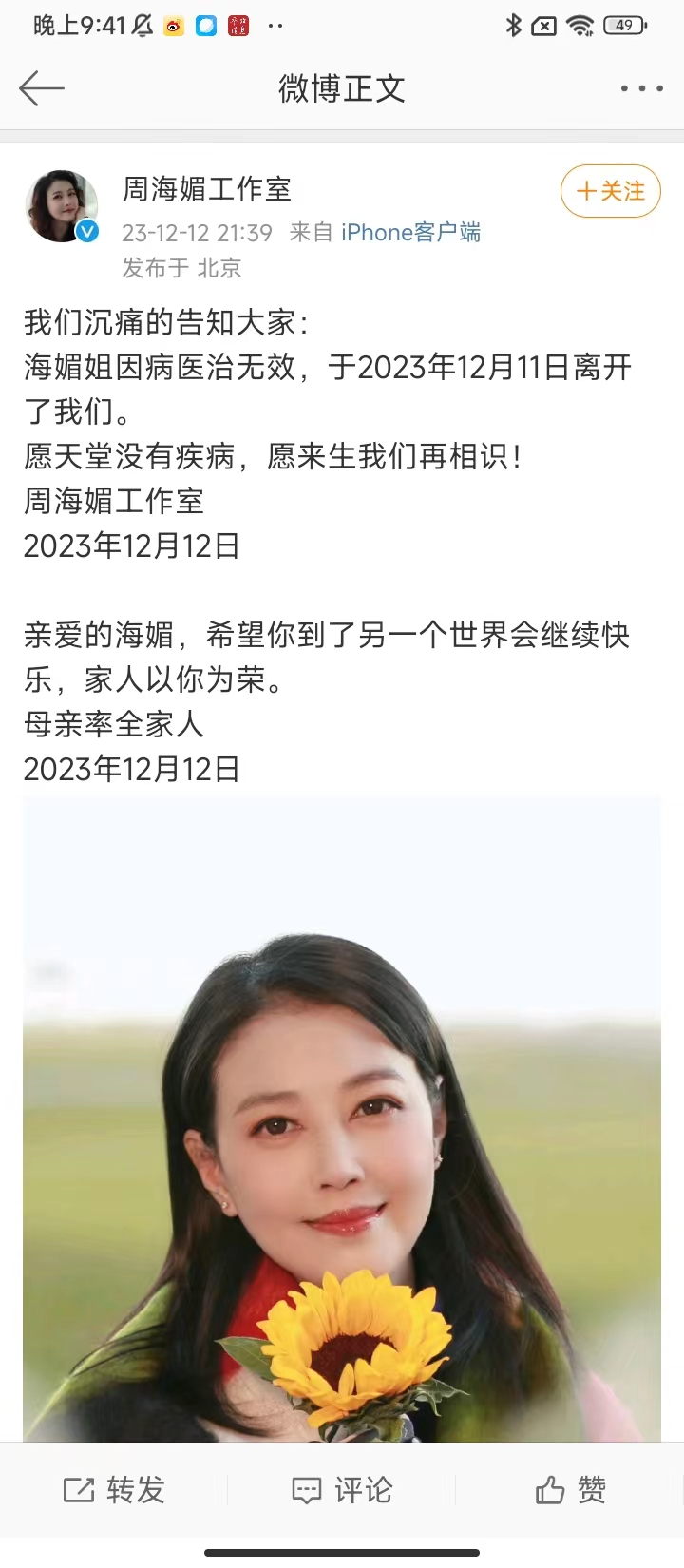 发布通告称,周海媚因病医治无效,于2023年12月11日离世。