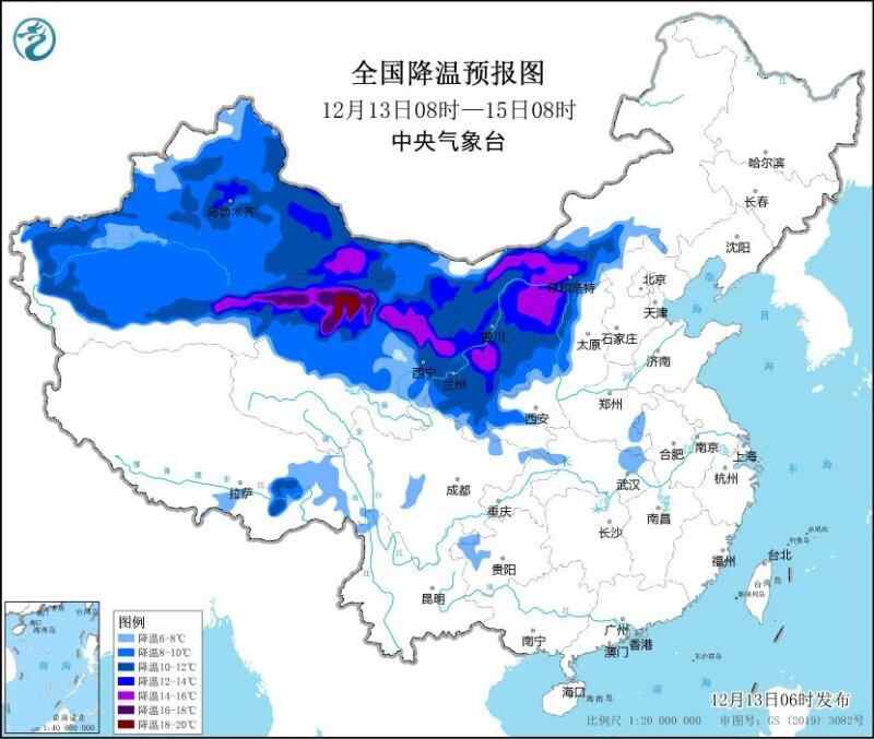 其中,12月13日08时至12月15日08时,新疆、内蒙古西部和中部、甘肃、宁夏、青海、陕西北部、山西西部等地将出现8~12℃降温,甘肃、宁夏、内蒙古河套地区、陕西北部局地降温可达14℃以上。