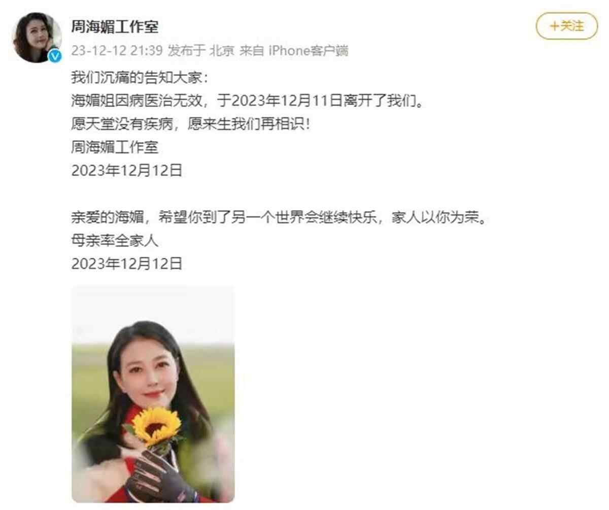 12月12日,周海媚工作室对外发布讣告,宣布周海媚因病医治无效,于2023年12月11日去世,享年57岁。12日晚,疑似周海媚生前送医院抢救的电子病历截图在网上被流传,病历上显示医院为北京顺义区某医院,并记载了周海媚个人资料、就诊时间等相关信息。13日上午九时,记者多次拨打该医院电话,均无人接听。