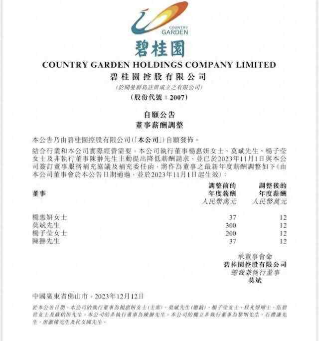 12日晚间,碧桂园控股发布公告称,结合行业和公司实际经营需要,公司执行董事杨惠妍、莫斌、杨子莹及非执行董事陈翀主动提出降薪的请求,四人年薪均下降至一年12万元。