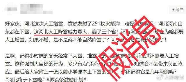 近日,河北、山东、河南等地迎来了今年的第一场雪。但在网上,有消息称此次降雪系“河北发射251枚火箭弹进行的人工增雪所致”。