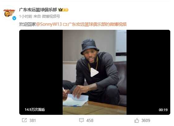 12月14日,@广东宏远篮球俱乐部 官宣,欢迎三冠功勋外援威姆斯回家,并展示了签约的视频。在视频中,威姆斯高兴地说:“我回家了,我正在签合同!”