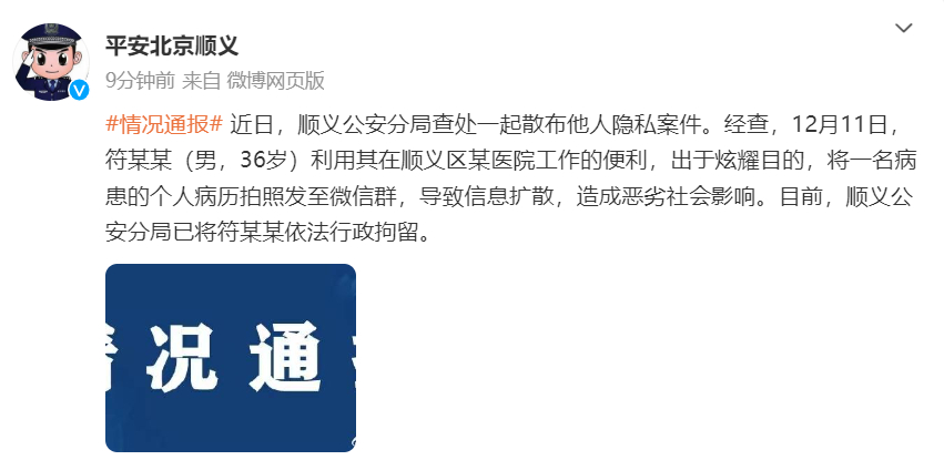 12月14日,北京市公安局顺义分局发布通报:近日,顺义公安分局查处一起散布他人隐私案件。经查,12月11日,符某某(男,36岁)利用其在顺义区某医院工作的便利,出于炫耀目的,将一名病患的个人病历拍照发至微信群,导致信息扩散,造成恶劣社会影响。目前,顺义公安分局已将符某某依法行政拘留。