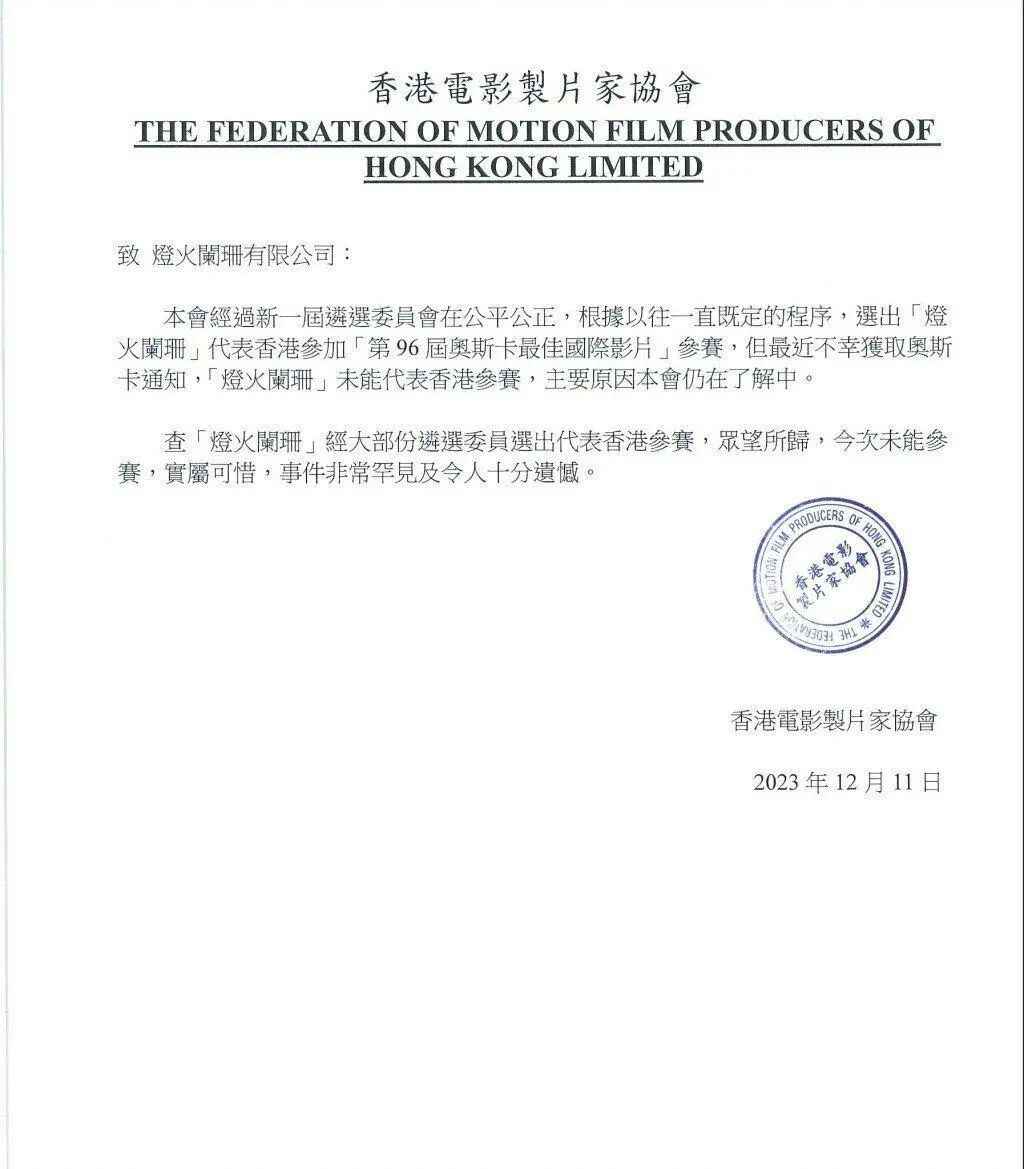 据奥斯卡主办方规定,最佳国际影片由各地电影界提交各自代表作品,香港地区的代表作品由香港电影制片家协会选出并提交。今年10月,《灯火阑珊》获得该协会董事局一致推选,代表香港角逐奥斯卡。