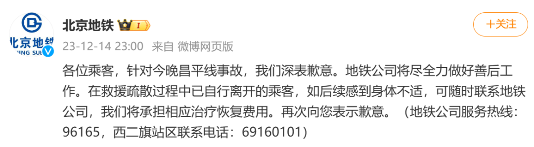 23:00,@北京地铁发博表示歉意:各位乘客,针对今晚昌平线事故,我们深表歉意。地铁公司将尽全力做好善后工作。在救援疏散过程中已自行离开的乘客,如后续感到身体不适,可随时联系地铁公司,我们将承担相应治疗恢复费用。再次向您表示歉意。