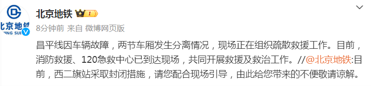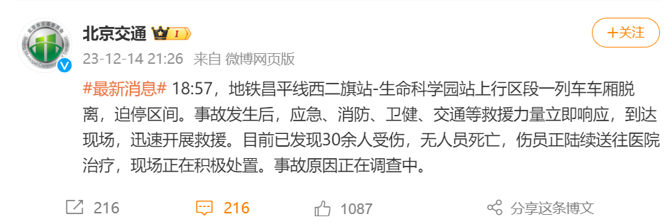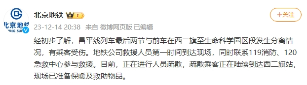 北京市交通委员会官方微博@北京交通 14日通报:18:57,地铁昌平线西二旗站-生命科学园站上行区段一列车车厢脱离,迫停区间。事故发生后,应急、消防、卫健、交通等救援力量立即响应,到达现场,迅速开展救援。目前已发现30余人受伤,无人员死亡,伤员正陆续送往医院治疗,现场正在积极处置。事故原因正在调查中。