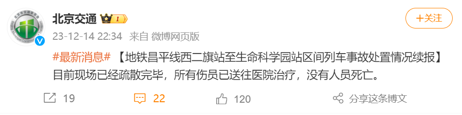 22:34,@北京交通 再次通报:目前现场已经疏散完毕,所有伤员已送往医院治疗,没有人员死亡。