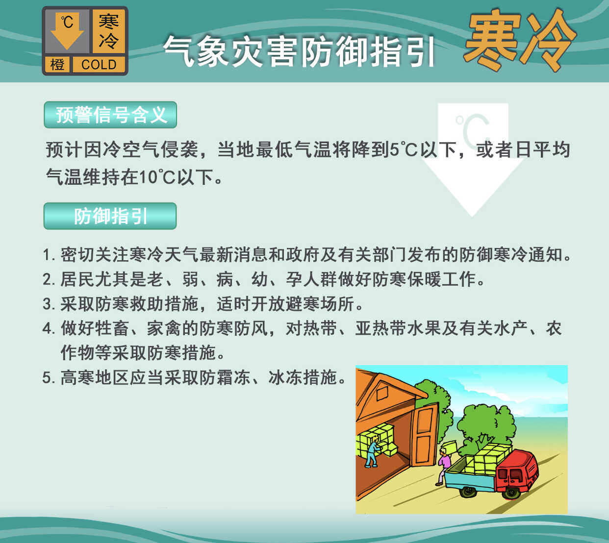 根据寒冷橙色预警信号防御指引,气象部门请市民密切关注寒冷天气最新消息和政府及有关部门发布的防御寒冷通知。居民尤其是老、弱、病、幼、孕人群做好防寒保暖工作。各区需采取防寒救助措施,适时开放避寒场所。做好牲畜、家禽的防寒防风,对热带、亚热带水果及有关水产、农作物等采取防寒措施。高寒地区应当采取防霜冻、冰冻措施。