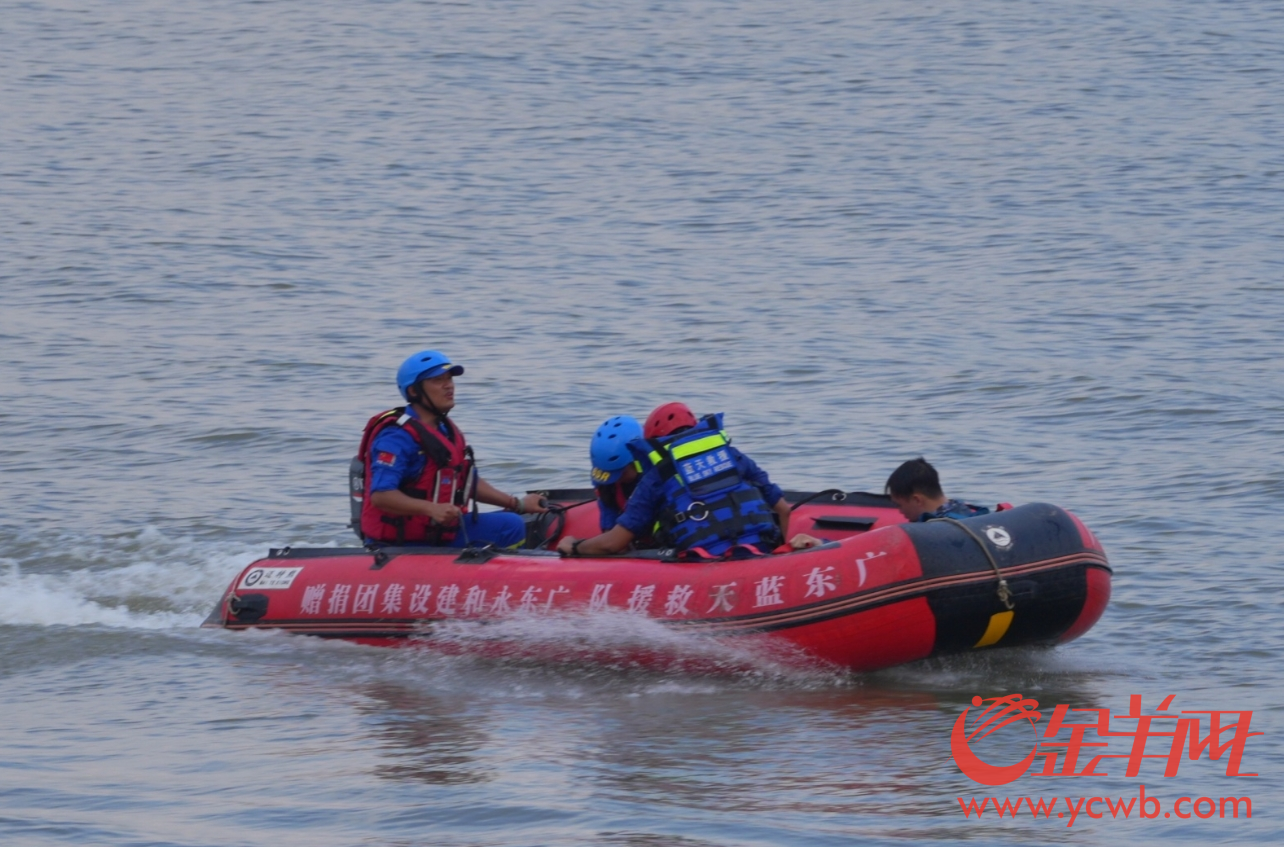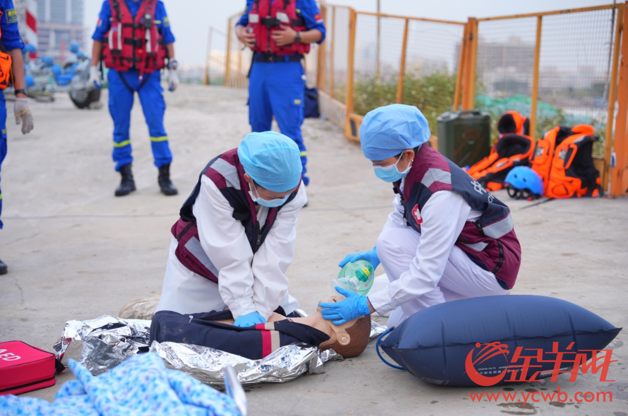 同时,演练过程中模拟了一艘船舶疑似失控闯进沉管寄存区,船只上有两人不慎落水的情景。险情发生后,现场指挥部立即指挥水上救援组和无人机队伍紧急出动,搜索落水群众。水上救援组驾驶橡皮艇靠近落水者,成功把1名落水人员营救上岸。同时,医疗队伍在码头上待命,对伤病群众进行救治,并用毛毯进行包裹,防止落水人员失温,并送其前往医疗处。
