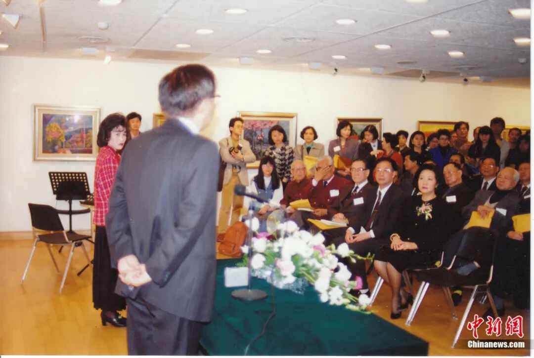 1993年,陈为江访台期间参加台湾作家柏杨的书籍发布会,主办方安排他(前排左五)与蒋纬国(前排左四)坐在一起。(受访者供图)