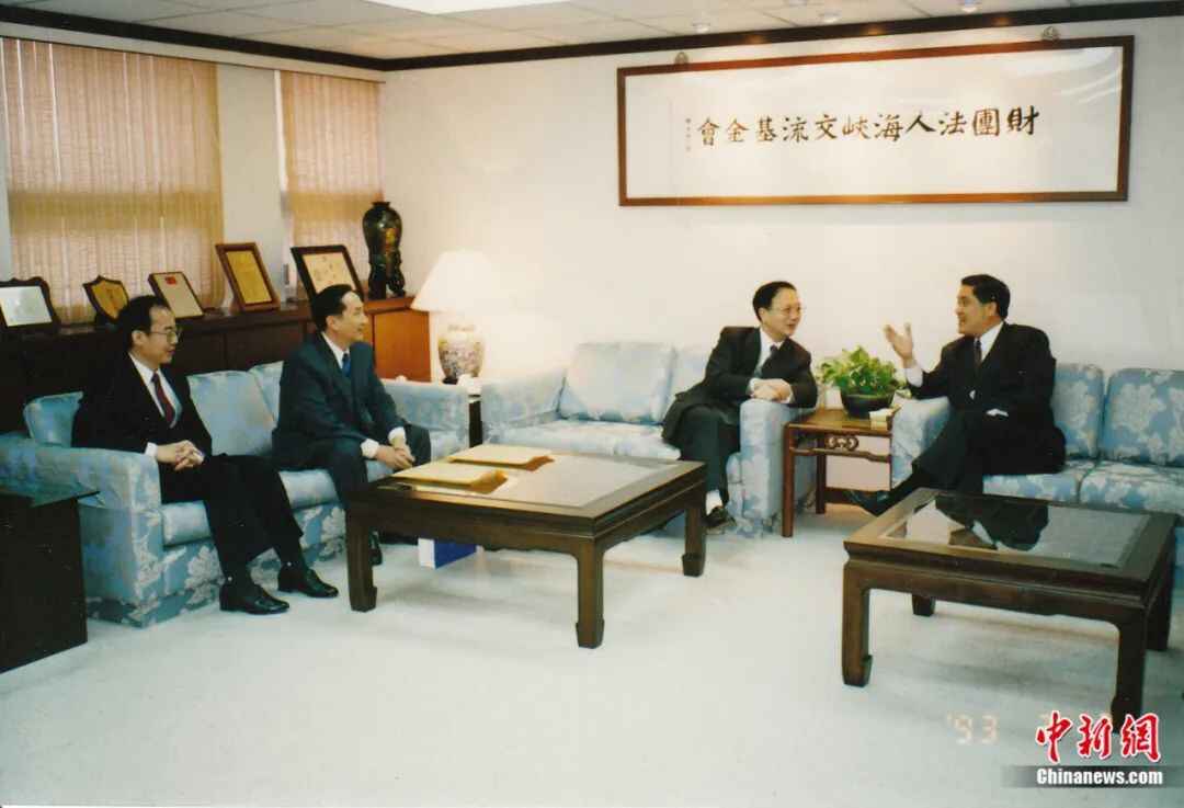 1993年春,陈为江访台期间拜会台湾海基会,图为陈为江(右二)和海基会副秘书长李庆平(右一)。(受访者供图)
