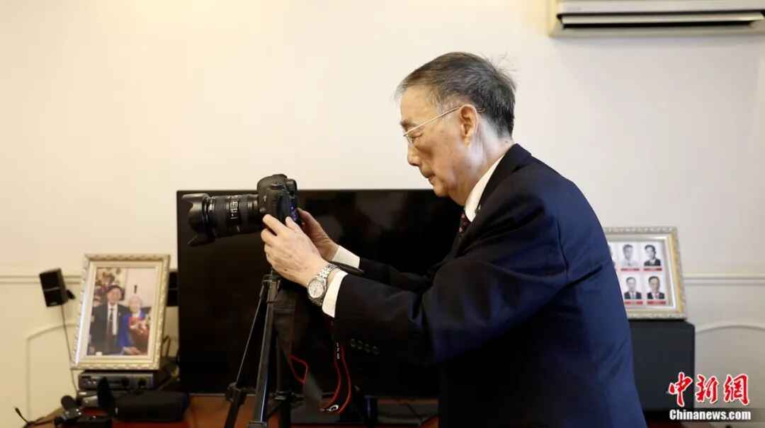 6月25日,陈为江在北京家中为到访客人拍照留念。中新社记者 李雪峰 摄