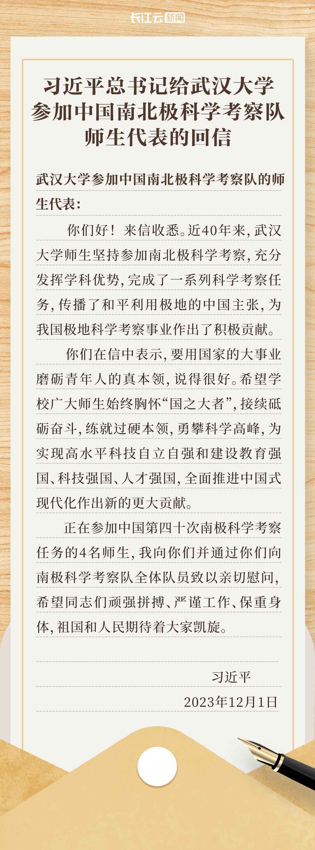 12月1日,习近平总书记给武汉大学参加中国南北极科学考察队师生代表回信。总书记在回信中指出:“希望学校广大师生始终胸怀‘国之大者’,接续砥砺奋斗,练就过硬本领,勇攀科学高峰,为实现高水平科技自立自强和建设教育强国、科技强国、人才强国,全面推进中国式现代化作出新的更大贡献。”
