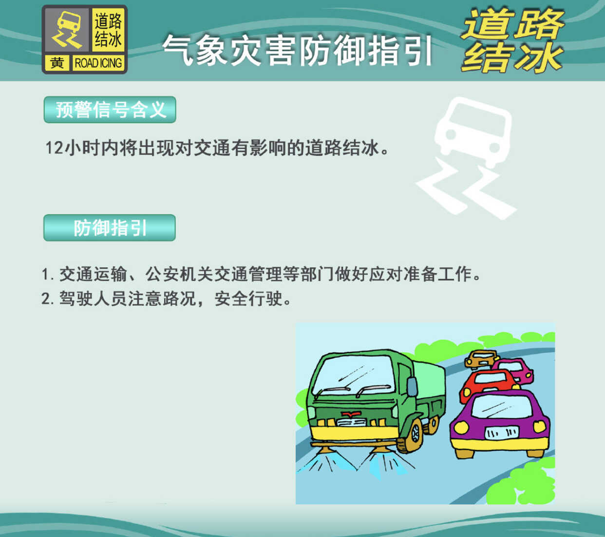 根据道路结冰黄色预警信号含义,当地12小时内将出现对交通有影响的道路结冰。请交通运输、公安机关交通管理等部门做好应对准备工作;驾驶人员注意路况,安全行驶。