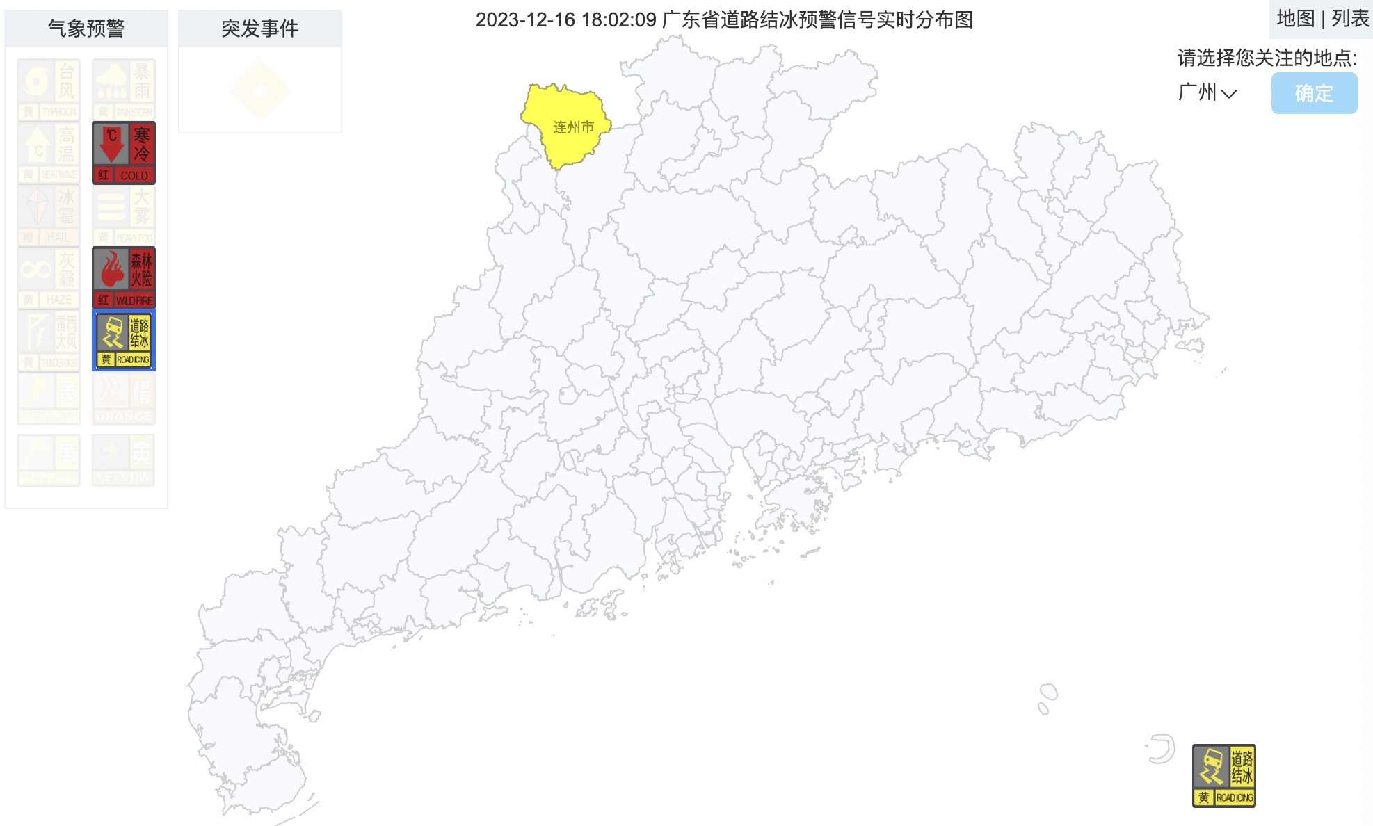 继首个寒冷红色预警信号发布后,连州市气象台在12月16日17时38分,发布本轮寒潮期间广东首个道路结冰黄色预警信号。由于寒潮对广东的影响仍在持续,不排除后续仍有地方发布道路结冰预警。