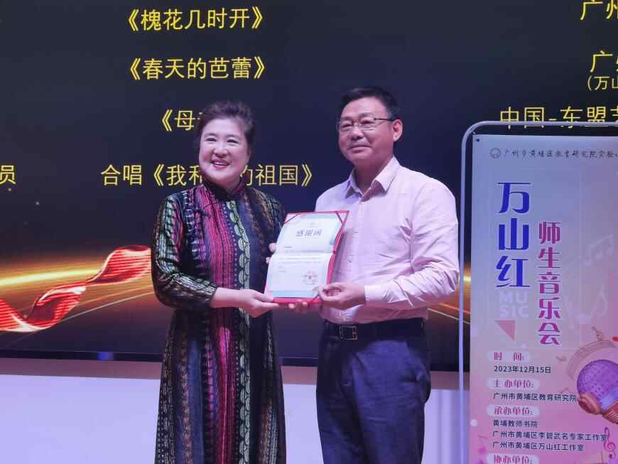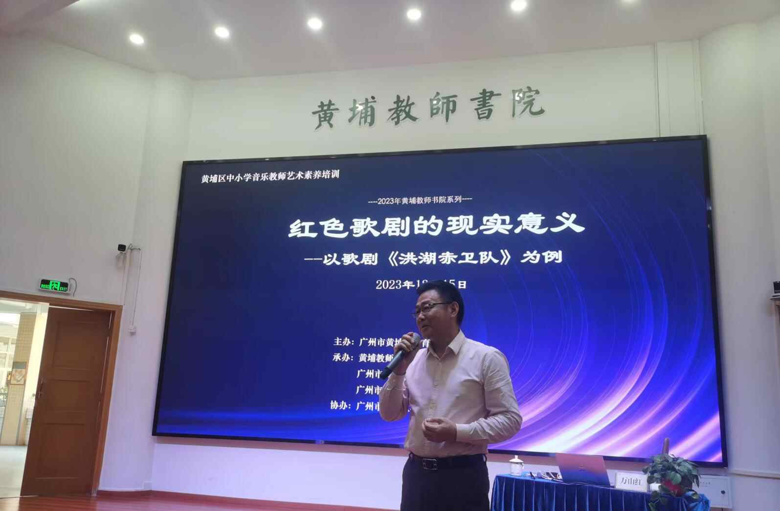 为进一步提升全区中小学音乐教师艺术素养,推动音乐素质教育的普及与提高,推进对口教育协作地区的协同发展,2023年12月15日,由黄埔区教育研究院主办,黄埔教师书院、黄埔区李碧武名专家工作室、黄埔区万山红工作室承办的系列名家讲座在黄埔区教育研究院实验小学三楼报告厅以线上线下相结合的方式隆重举行,特邀请我国著名女高音歌唱家万山红老师进行《红色歌剧的现实意义--以歌剧<洪湖赤卫队>为例》专题培训,并与万山红工作室成员一起,在现场和线上展示了一场美妙的音乐盛宴。