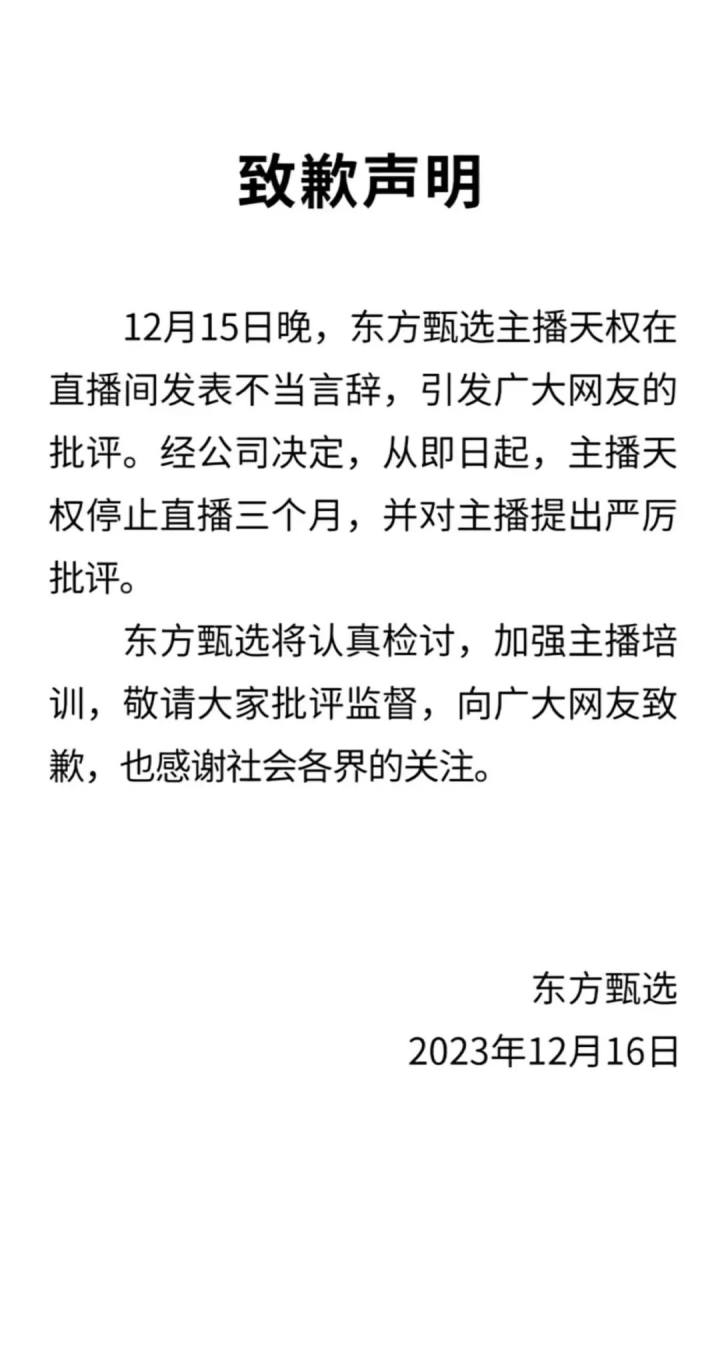 随后,东方甄选发布致歉声明,宣布主播天权停播3个月。主播天权也通过官方账号向网友致歉。