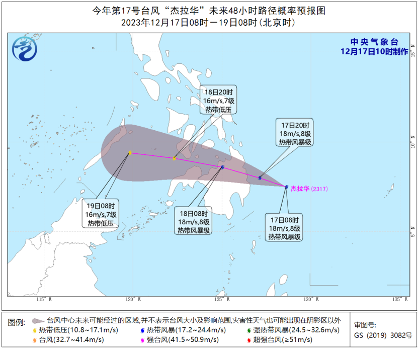 预计,“杰拉华”将以每小时15公里左右的速度向西偏北方向移动,强度变化不大,并将于今天夜间在菲律宾棉兰老岛东部沿海登陆,登陆时中心附近最大风力8级,而后强度缓慢减弱。