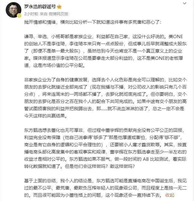 随后,@罗永浩的辟谣号 发文称,东方甄选想“去董化”也无可厚非,但过程中董宇辉的贡献完全没有得到公平公正的回报,利益完全没有保障(他自己说拿得“够多了”那是他厚道或害怕,分配得“够不够”,商业是有它自身的逻辑和公平合理性的)。其实,按直播电商头部化高度集中的客观事实和规律,董宇辉在东方甄选拿走至少一半的收益才是相对公平的。