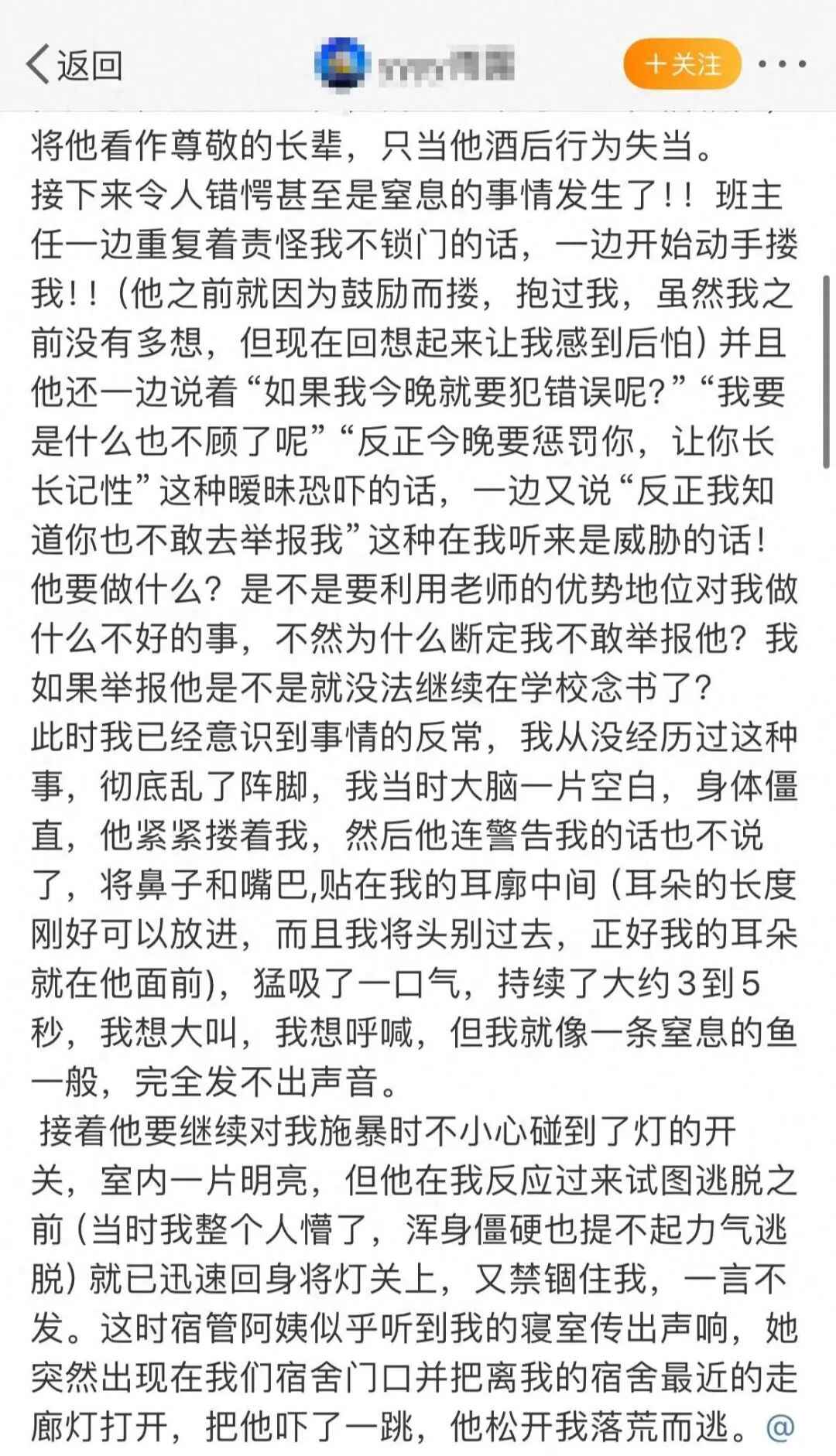 “宿舍阿姨似乎听到我的寝室传出声响,她突然出现在我们宿舍门口并把离我的宿舍最近的走廊灯打开,把他吓了一跳,他松开我落荒而逃。”该女生文中写道。