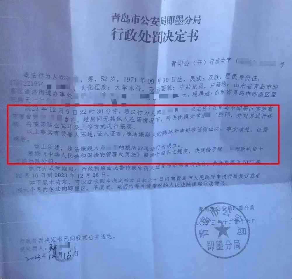 16日,该女生在其账号发了一份青岛市公安局即墨分局的行政处罚决定书。其中提到,违法行为人郑某某,52岁。2023年12月9日22时30分许,违法行为人郑某某在青岛市即墨区实验高中宿舍,趁房间无其他人在场情况下,用手抚摸女学生脸部,并对其进行搂抱,将嘴贴在其耳朵上等方式进行猥亵。以上事实有受害人陈述,证人证言,违法嫌疑人的陈述和申辩等证据证实,事实清楚,证据确凿。