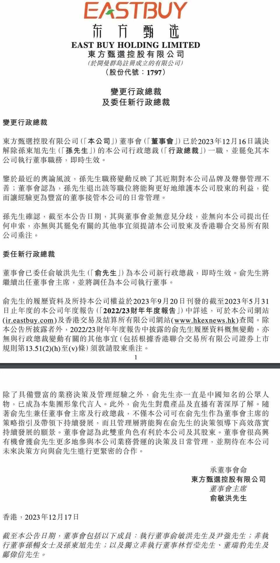 12月17日晚间,东方甄选在港交所发布公告称,解除孙东旭行政总裁、执行董事职务。