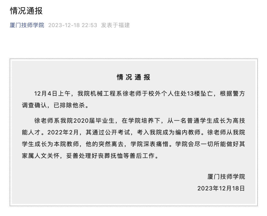 近日,厦门技师学院25岁班主任徐某辉跳楼自杀一事在网上引发热议。12月18日晚,厦门技师学院发布情况通报: