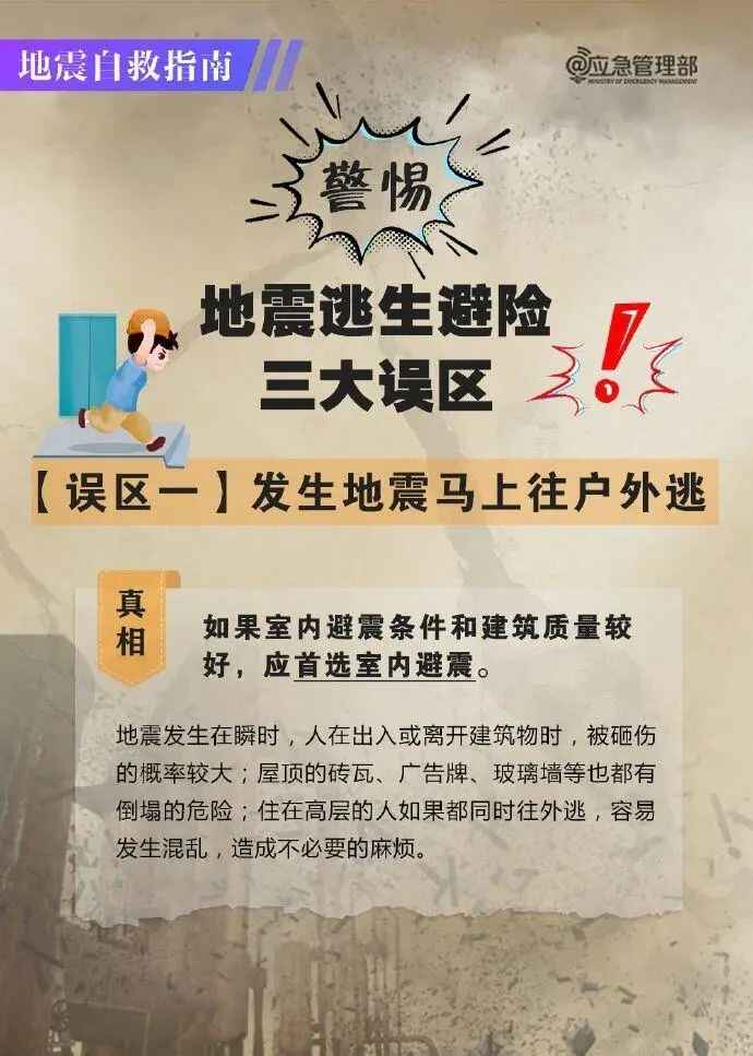 收到地震预警信息后,可以马上往户外逃吗?可以躲入衣柜等家具里吗?可以趴在地上或者躺着等待救援吗?更多注意事项看图了解↓