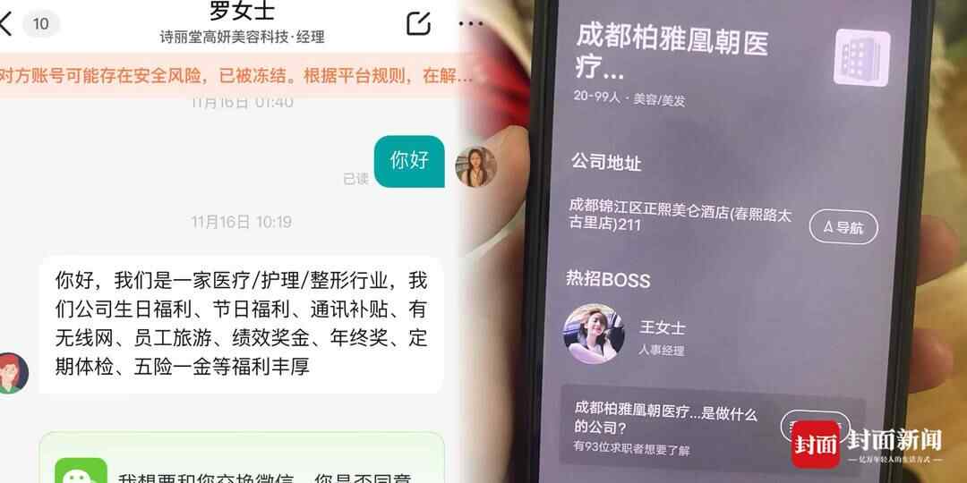 当事人提供的截图显示,发来邀请的公司分别为成都双流柏雅凰朝医疗美容诊所有限公司、诗丽堂高妍美容科技,这两家公司均为成都本土的连锁品牌。因为存在安全风险,两个账号已被平台冻结。