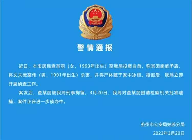 2023年3月20日,苏州市公安局姑苏分局发布警情通报称,近日,该市居民查某丽(女,1993年出生)至该局投案自首,称其因家庭矛盾,将丈夫庞某伟(男,1991年出生)杀害,并将尸体藏于家中冰柜。案发后,查某丽被警方刑事拘留。3月20日,公安机关对查某丽提请检察机关批准逮捕。