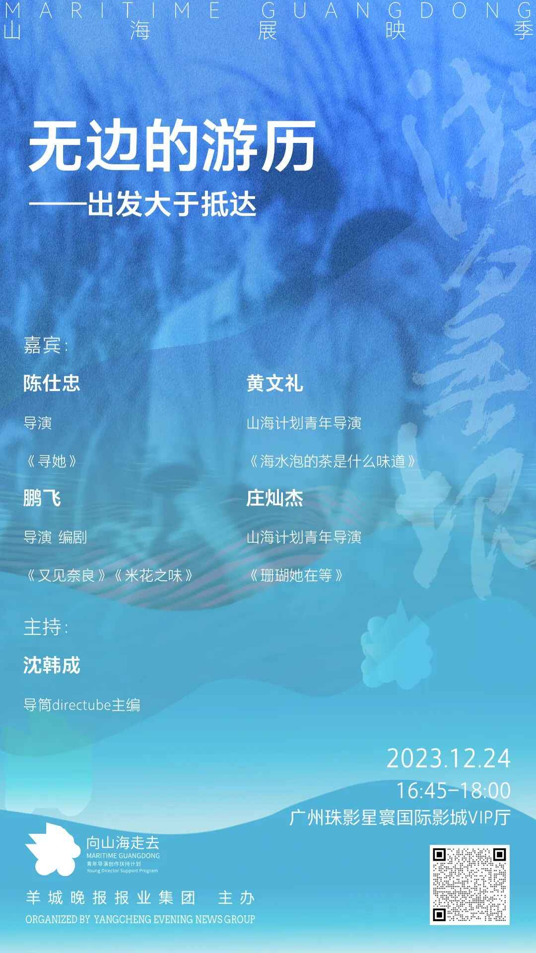 沙龙将由知名电影媒体“导筒”主编沈韩成主持。“导筒”一直致力于帮导演传递声音、分享观点。活动将同步在视频号“2023山海计划”直播,欢迎预约观看。