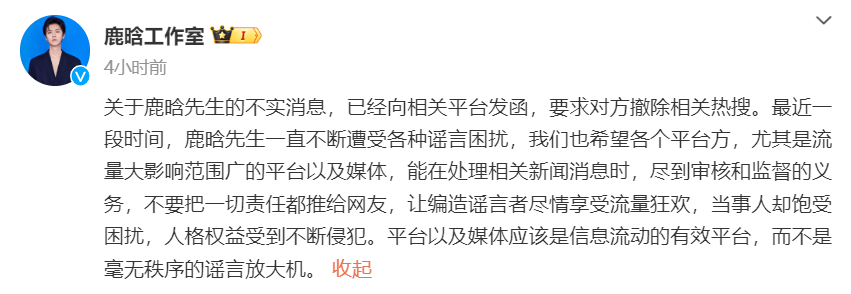鹿晗工作室表示:“最近一段时间,鹿晗先生一直不断遭受各种谣言困扰,我们也希望各个平台方,尤其是流量大影响范围广的平台以及媒体,能在处理相关新闻消息时,尽到审核和监督的义务,不要把一切责任都推给网友,让编造谣言者尽情享受流量狂欢,当事人却饱受困扰,人格权益受到不断侵犯。平台以及媒体应该是信息流动的有效平台,而不是毫无秩序的谣言放大机。”
