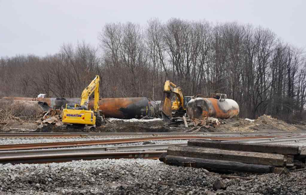 2月14日,在美国俄亥俄州东巴勒斯坦镇,挖掘机在事故现场处理污染土壤。新华社发(章焱飞摄)