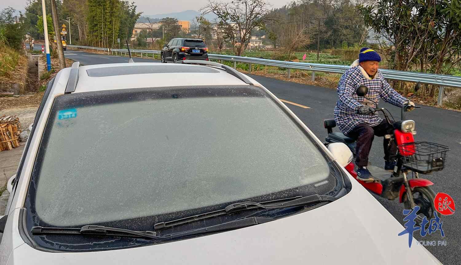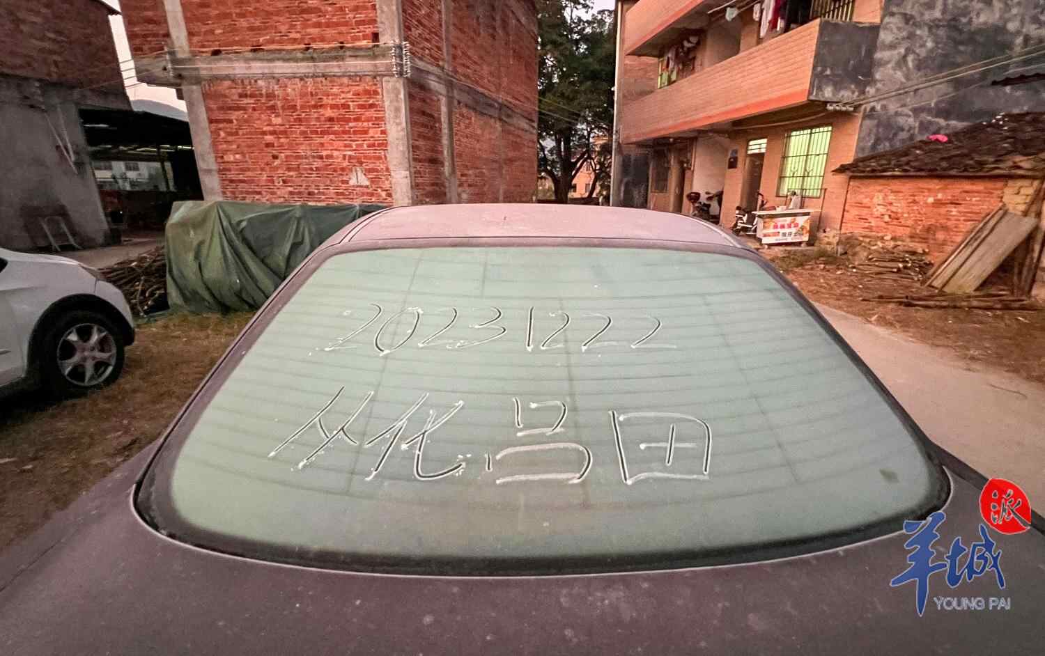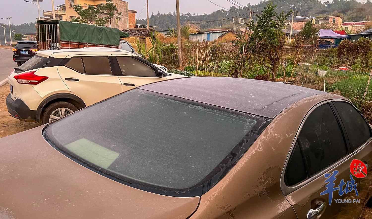 当日6时许,羊城晚报全媒体记者驾车沿大广高速吕田出口进入吕田中心镇区,沿途可见多辆停在路边的汽车车身和车窗位置均结有一层霜。一些汽车结霜较厚,用手擦拭霜体,可见霜一层层剥落。