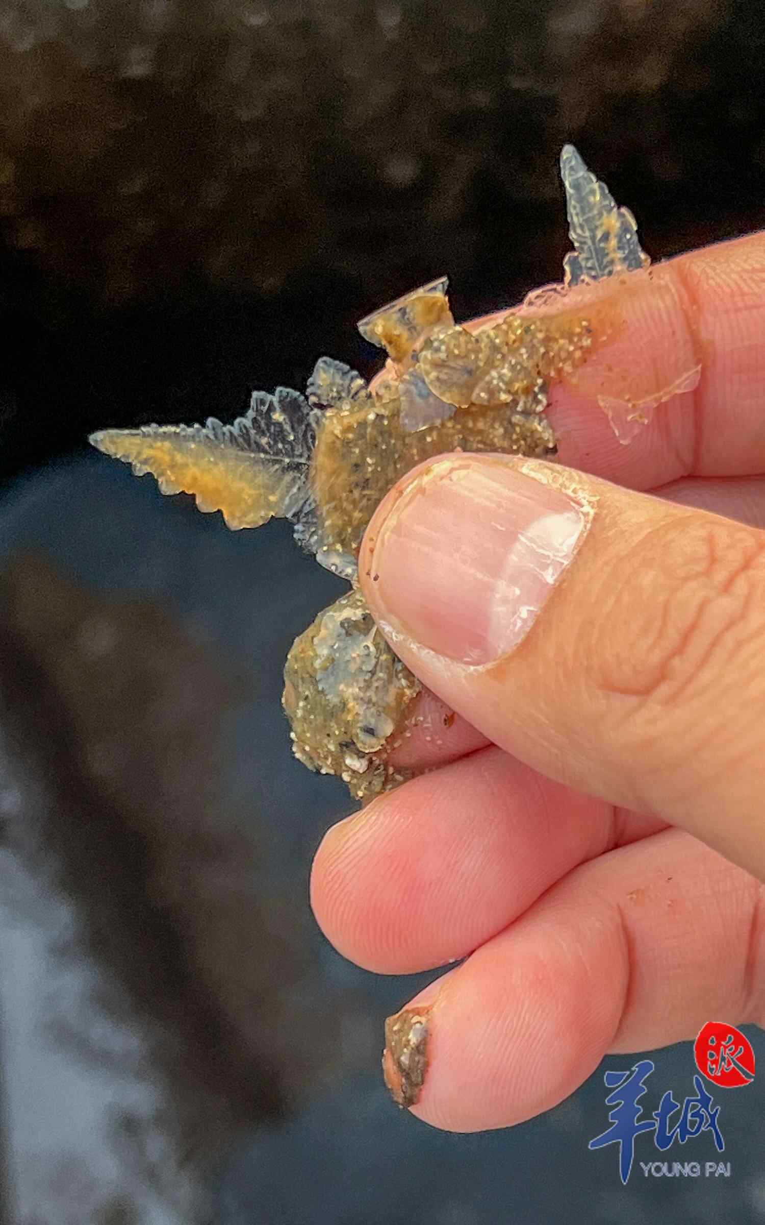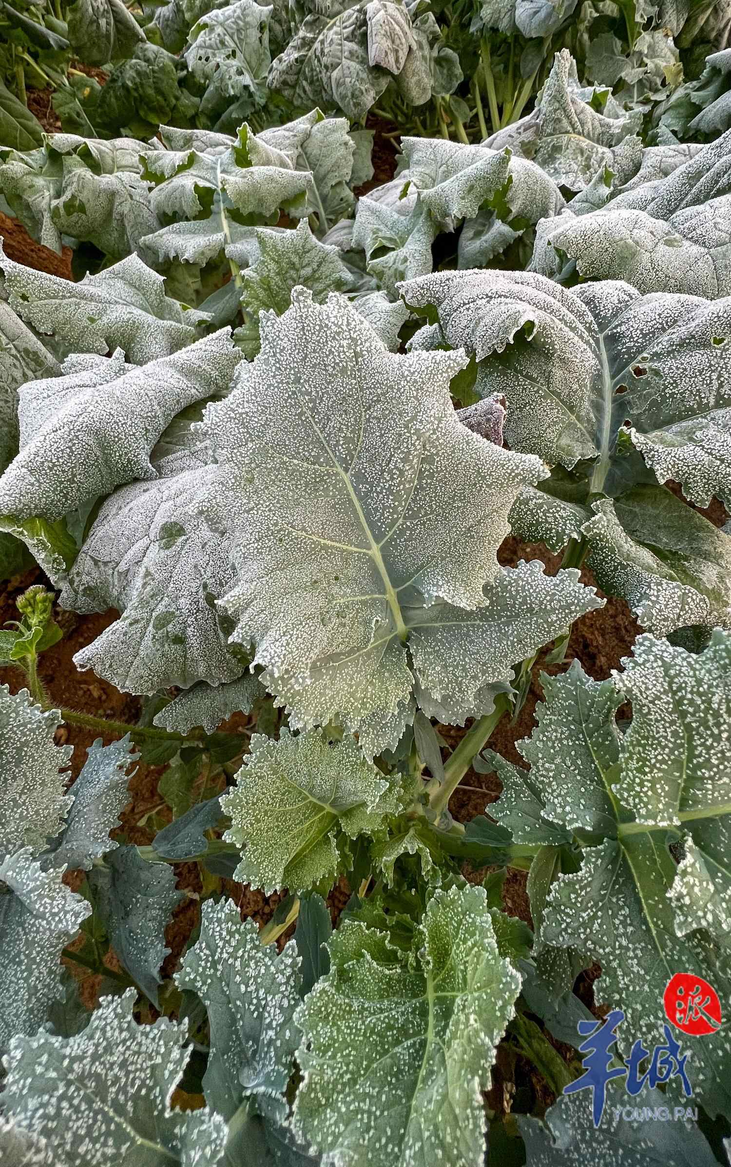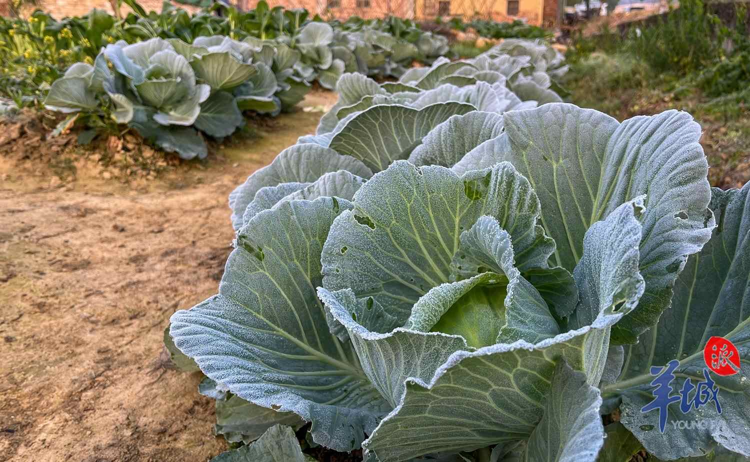 穿过中心镇区进入吕中村,记者看到多个菜田内的蔬菜菜叶同样结有一层霜,有的蔬菜被霜冻出一个个犹如“花之恋”寿司般的“冷冻造型”。